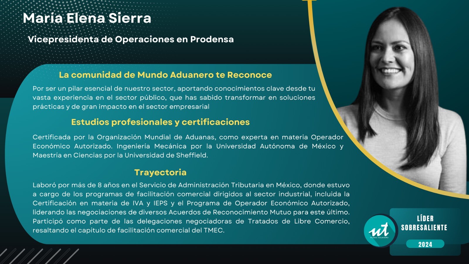 "The Mundo Aduanero community acknowledges Maria Elena as an essential pillar in the Customs and Logistics field, highlighting her ability to transform her vast experience in the public sector into practical, high-impact solutions for the business sector. Her deep expertise and visionary leadership have been key in Prodensa's ongoing evolution as a benchmark in foreign trade services."