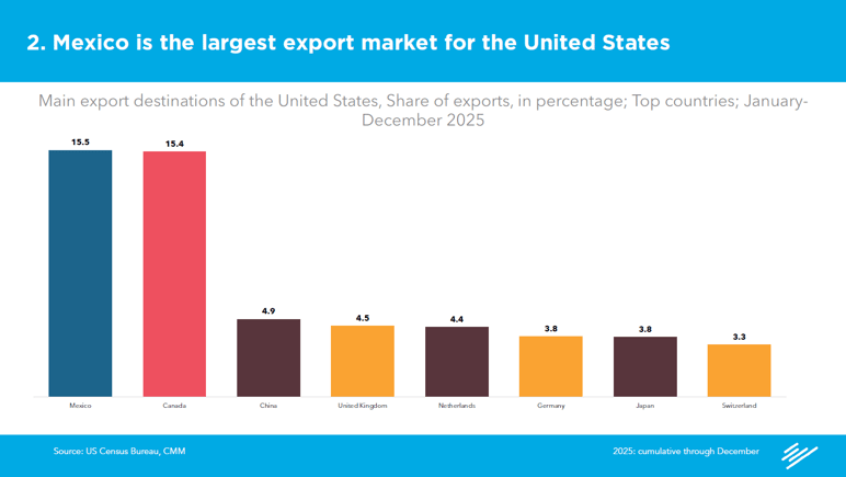 Insights presented highlighted the depth of economic integration between both countries. Mexico remains the largest export market for the United States, accounting for approximately 15.5% of total U.S. exports in 2025, slightly ahead of Canada. Additionally, Mexico is the largest or second-largest export destination for 75% of U.S. export sectors, underscoring its critical role in North American supply chains.