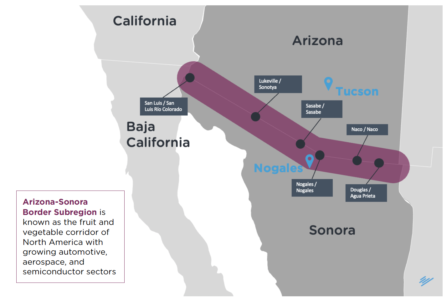 The Tucson-Nogales corridor is another successful example of the Twin Sister Cities Model, serving as a major gateway for trade between Arizona and Sonora. Tucson’s role as a distribution and logistics hub is complemented by Nogales’ position as a key entry point for Mexican exports, particularly in agribusiness and electronics.