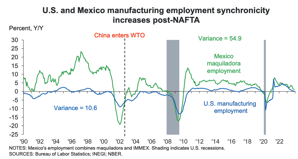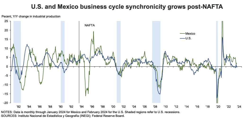 Today, trade between both nations is well diversified across sectors, and it’s comprised of mostly intermediate goods (also known as intra-industry trade). Since NAFTA we have seen greater levels of business cycle synchronization between the U.S. and Mexico.