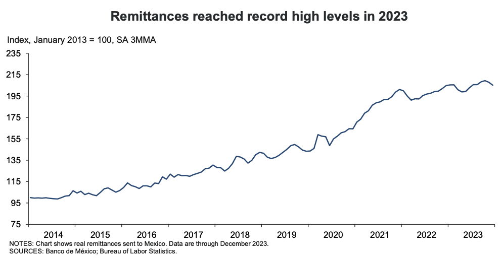 Remittances, the money that Mexican migrants working in the US send back home, play a vital role in the Mexican economy. In 2023, remittances to Mexico from the US reached a record high of nearly $61 billion (Banxico via Tukan), representing an 8% growth over 2022. Further, in 2022 remittances amounted to 4.5% of Mexico's GDP, up from about 2.5% a decade ago. Border states make up over half of the total remittances from the United States.