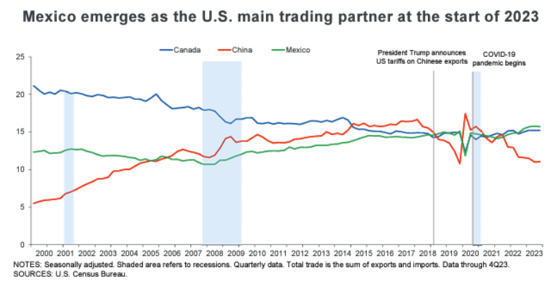 The North American Free Trade Agreement (NAFTA), implemented in 1994, ushered in a new era of economic integration between the United States, Mexico, and Canada. Since then, trade between the US and Mexico has flourished. Trade of goods has grown from $206 billion in 1994 to $799 billion in 2023, adjusted for inflation. In fact, Mexico surpassed China to become the United States' leading trading partner in 2023, a testament to the deep economic ties that bind our nations. The value of goods imported from Mexico rose nearly 5% to $475 billion compared to the value of Chinese imports, which fell 20% in the same period.