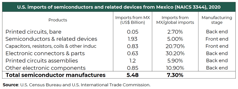 In Mexico, several US-based companies conduct R&D, design, assembly and test manufacturing in different parts of Mexico. Mexico exported over 30% of the electronic connectors and parts used in backend semiconductor production in the United States (U.S. International Trade Commission, 2020) in additional to other components.