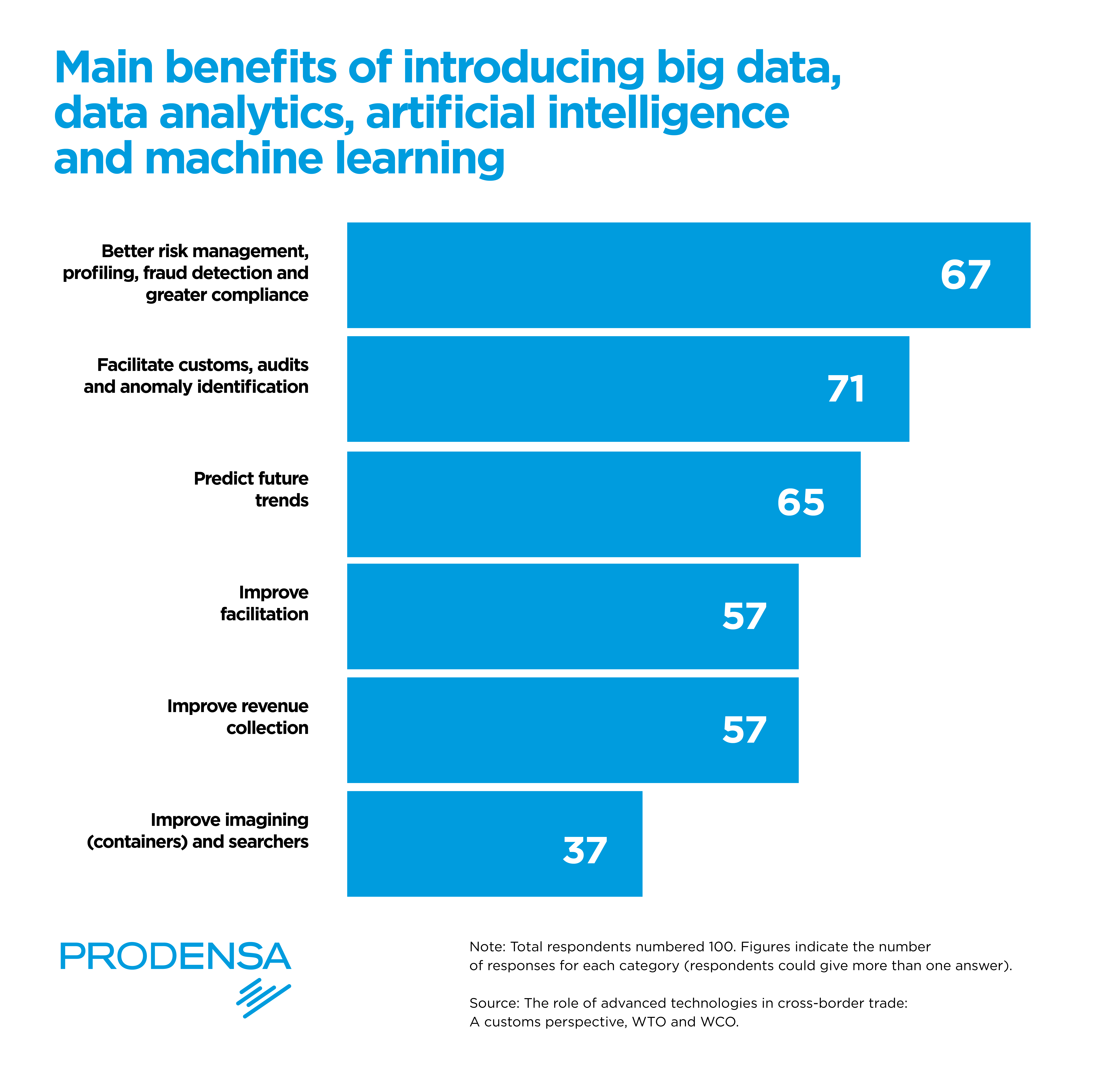 According to a study conducted by the World Trade Organization in collaboration with the World Customs Organization, big data, data analysis, artificial intelligence, and machine learning are expected to have the greatest future impact on customs operations. Of the 89 respondents, 36 gave it the highest rating (10).