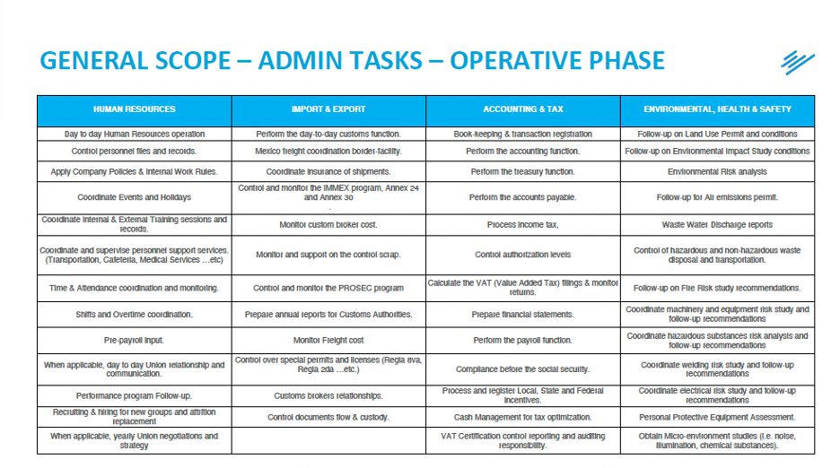 Taking the necessary time to properly establish a new operation is crucial. This includes both the hiring of employees and ensuring the operation complies with all required permits and registrations. In addition to the Social Security Registration, the new entity will also require new banks accounts to be setup, an accounting and procurement system, a payroll system, Importer of Record (depending on the type of imported goods), state payroll tax registration, suppliers, etc. Some permits, contracts and licenses can be transferred, while others will need to be prepared for the new entity.