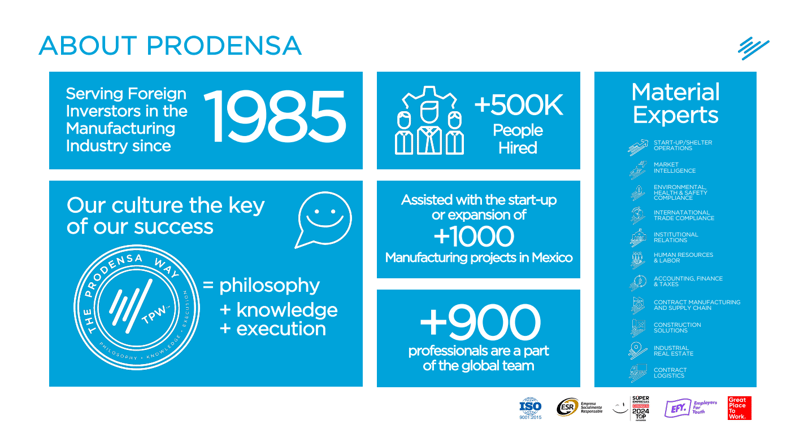 At PRODENSA, we have been at the forefront of the nearshoring boom, helping international firms successfully establish and scale operations in Mexico. With decades of experience and over 500,000 employees hired across industries, we provide unrivaled expertise in launching and managing large-scale shared service centers that drive business success.