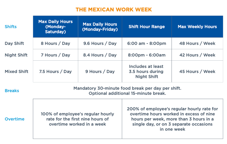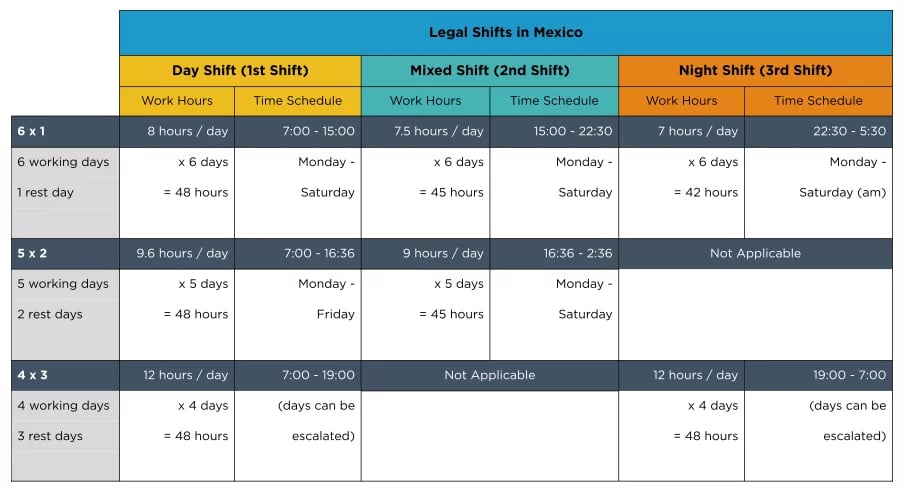 Mexico's legal workweek consists of 48 hours, typically spread over 6 days with 8-hour shifts. Work shifts are classified as: