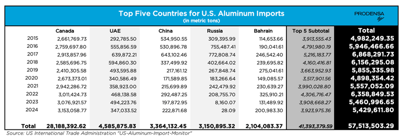 Top Five Countries for U.S. Aluminum Imports (in metric tons)