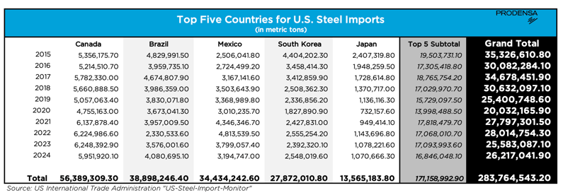 Top Five Countries for U.S. Steel Imports (in metric tons)