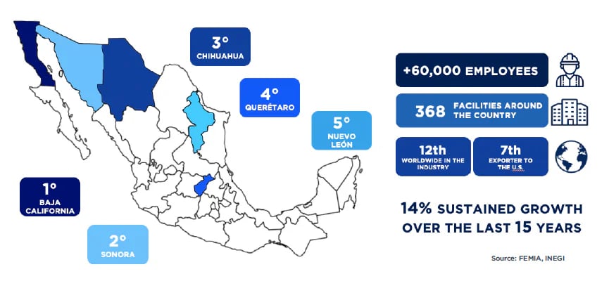 - Chihuahua – Leading the country in aerospace engineering talent and innovation centers. Chihuahua houses 25% of Mexico’s aerospace factories and produces both metal and composite components for global OEMs like Honeywell and Bell.