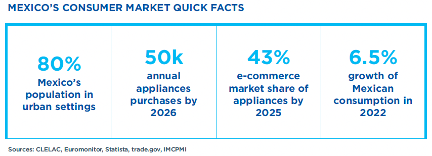 By 2025 the e-commerce market share of home appliance purchases in Mexico will reach 43%, up from 23% in 2021 (Statista).