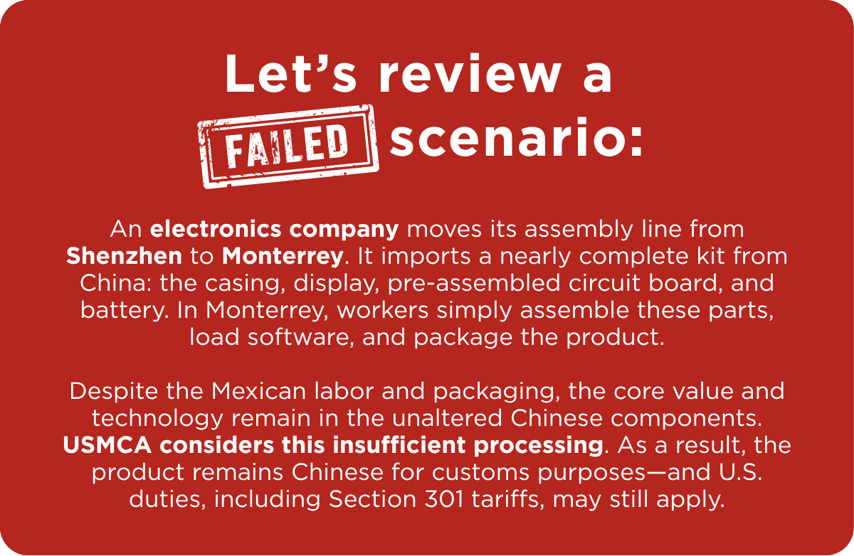 • Value-added processes like SMT, machining, or yarn-forward textile strategies can help meet USMCA thresholds.