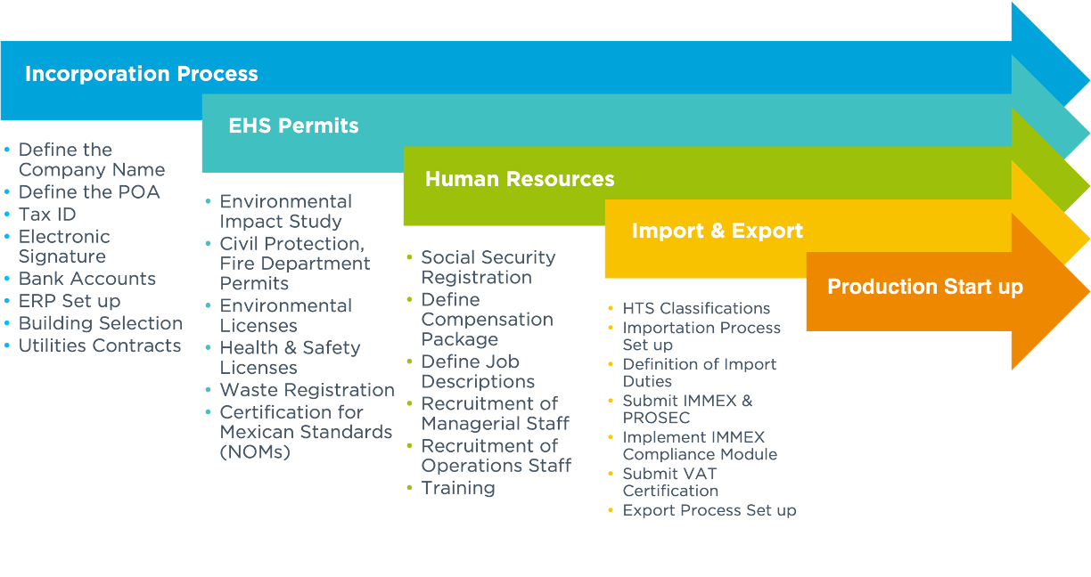 Operative Phase. The most value-add is provided by experts mitigate risks and ensure compliance of the operation. Local partners provide administration over the key functional areas of the business, as well as coordinate complimentary services to ensure the productivity of the operation in Mexico.